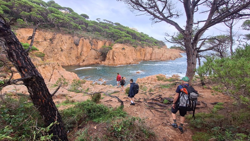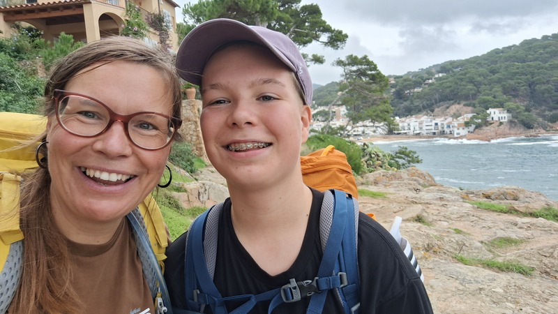 Het pad slingert verder langs de kustlijn, via mooie baaien, trappen of rotsen, met knappe uitzichten mét selfiepalen en eindigt in Calonge waar we, ondanks de wat donkere lucht, getrakteerd worden op een prachtige dubbele regenboog. Onze hartjes maken een sprongetje bij dit klein gelukje en het geeft instant energie voor de laatste kilometers.